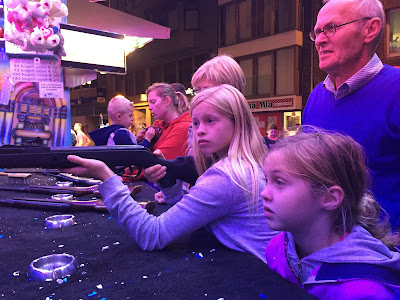 Nog een laatste keer lekker gaan eten...En na het etentje zijn we nog eens naar de kermis getrokken voor ritjes in de boksauto's (die veel sneller gaan dan bij ons) en de rups (mijn favoriet van vroeger). Zoe en Elise mochten elk nog 1 iets kiezen en terwijl Elise voor het eendjeskraam koos, koos Zoe voor het schietkraam en tot mijn verbazing is ze daar super goed in :)